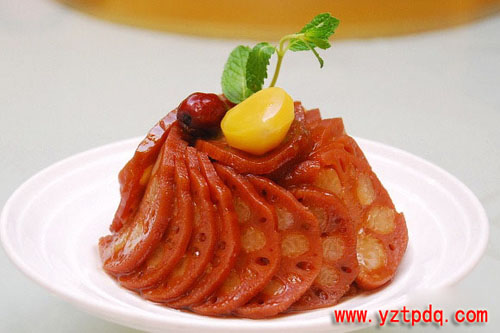 蜜餞捶藕為揚州寶應十大名菜之首,曾載入清宮御食譜。它是用荷藕、糯米、蜜餞、白蓮為主原料,配以青梅、桔餅、蜂蜜等佐料,經燜、拍、炸、蒸等10多道工序制作而成。它色澤醬紅,香甜酥爛,素而不淡,濃而不膩,有健脾開胃、生津止渴、減肥降壓、益腎固精之功效。藕片軟糯,食之香甜不膩。