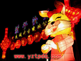 2006年春節,揚州工藝廠設計制作的一批傳統彩燈被送到了寶島臺灣。記者了解到,在這批花燈中,“百犬迎春”中一條大麥叮犬,長10米,高9米,體重達10噸,運用電腦科技制造出聲、光電動效果,會搖頭、昂首、動耳、擺尾,動作自然,會講十五種語言。及至今年,揚州花燈已連續6年春節為臺灣佛光山寺制作并展出了一批大型彩燈。